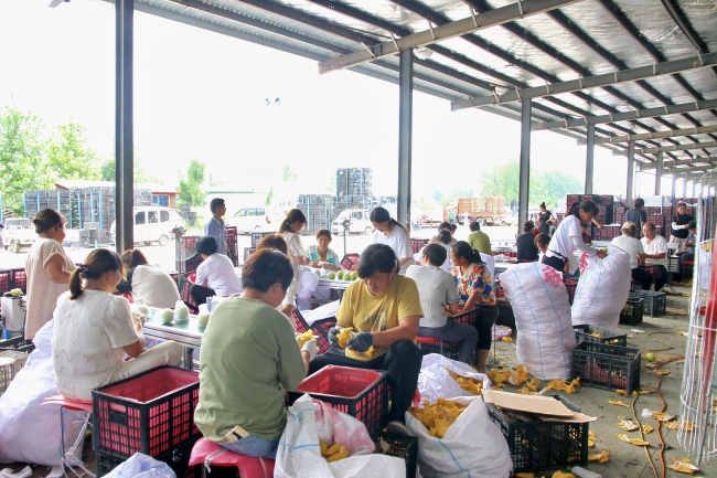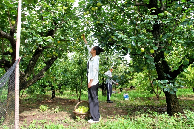 梨园内,翠绿的皇冠梨挂满枝头,采摘水果的职工挥汗如雨,一丝不苟地严把水果质量,仔细地采摘和认真分拣每一个梨子,确保每个梨子让客户和消费者满意。在包装车间,包装水果的职工正细心地将皇冠梨分类、挑选、套袋、装箱,包装好的皇冠梨通过物流源源不断地运往全国各地。