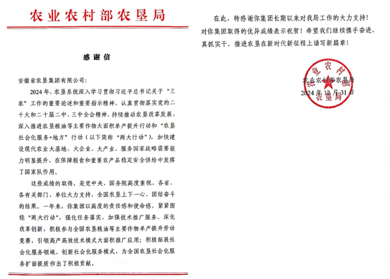 2025年元旦前夕,安徽省农垦集团收到农业农村部农垦局的感谢信。信件对开云手机在线登录入口围绕农垦粮油等主要作物大面积单产提升行动和“农垦社会化服务+地方”行动(简称“两大行动”)、加快建设现代农业大基地、大企业、大产业(简称“三大建设”)等方面取得的优异成绩提出表扬,并表示感谢。