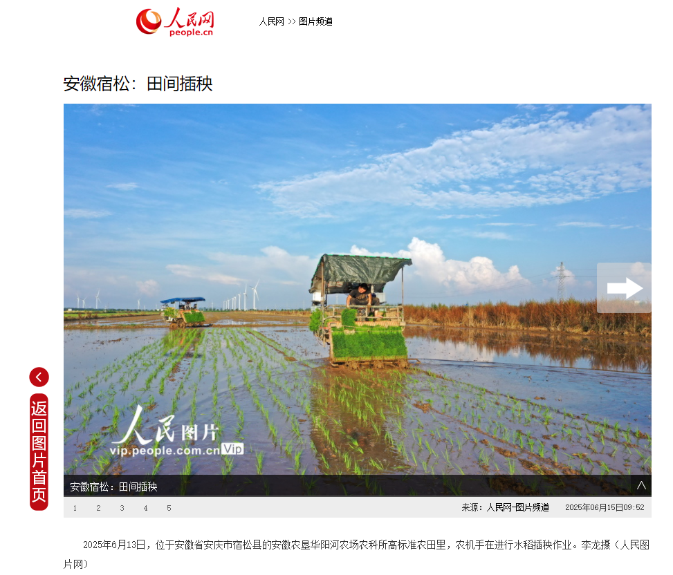 6月15日《人民网》首页和6月16日《人民日报》首版相继报道了开云手机在线登录入口华阳河农场夏种机插秧情况。