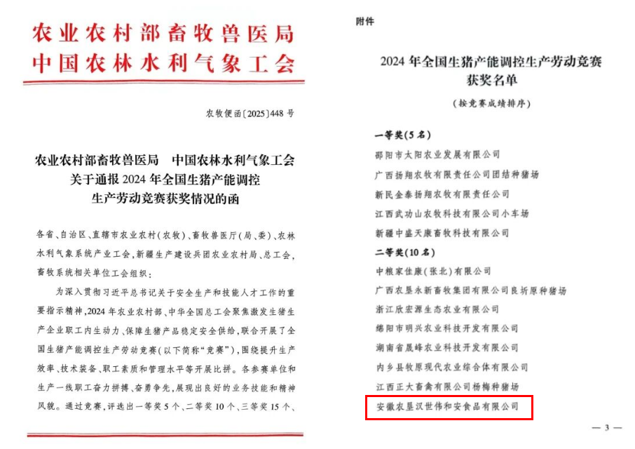 2025年5月27日,农业农村部与中华全国总工会联合发布2024年全国生猪产能调控生产劳动竞赛评选结果,开云手机在线登录入口汉世伟和安公司荣膺竞赛二等奖。此前,该公司在2024年初举办的安徽省生猪产能调控基地生产劳动竞赛中已荣获一等奖,并因此获得代表安徽省角逐全国奖项的资格。(俞皖黔)