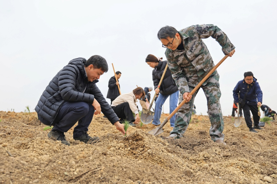 王仕超(前右)与南京林业大学林草学院负责人共植松树苗(李龙 摄)