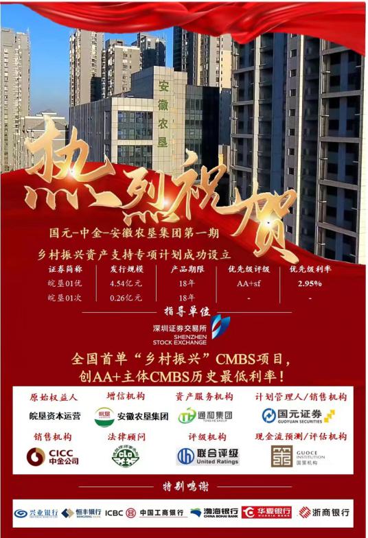 据悉,该项目为全国首单乡村振兴商业房地产抵押贷款支持证券(CMBS)项目,债券总发行规模为4.80亿元,其中“皖垦01优”发行规模为4.54亿元,发行期限为18年,票面利率为2.95%;“皖垦01次”发行规模为0.26亿元,发行期限为18年。债券发行利率创全国AA+主体CMBS 有史以来最低。该项目增信机构为开云手机在线登录入口集团,原始权益人和资产服务机构分别为开云手机在线登录入口集团下属的皖垦资本运营公司、通和集团公司,计划管理人为国元证券股份有限公司。